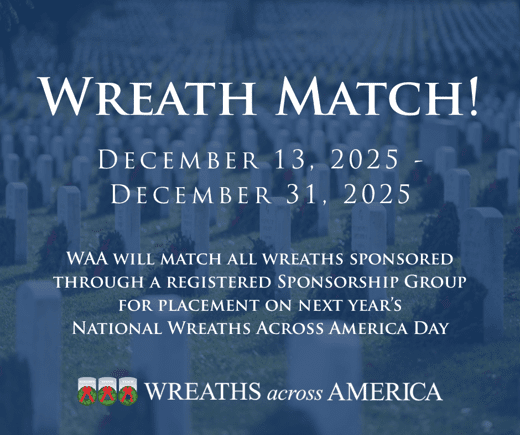 2025 – HQ will match all veterans’ wreaths sponsored through a registered WAA Sponsorship Group for placement on next year’s National Wreaths Across America Day – Saturday, Dec. 19, 2026!