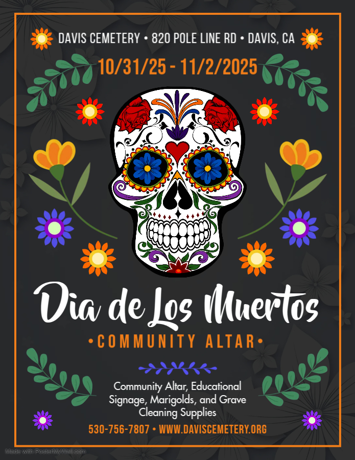 The Davis Cemetery District’s annual Día de los Muertos public altar was set up on Friday, October 31st and will remain in place through November 2nd. In addition to the altar, we will display educational signage, gravesite cleaning supplies, and fresh marigolds for visitors to place on the graves of their loved ones.