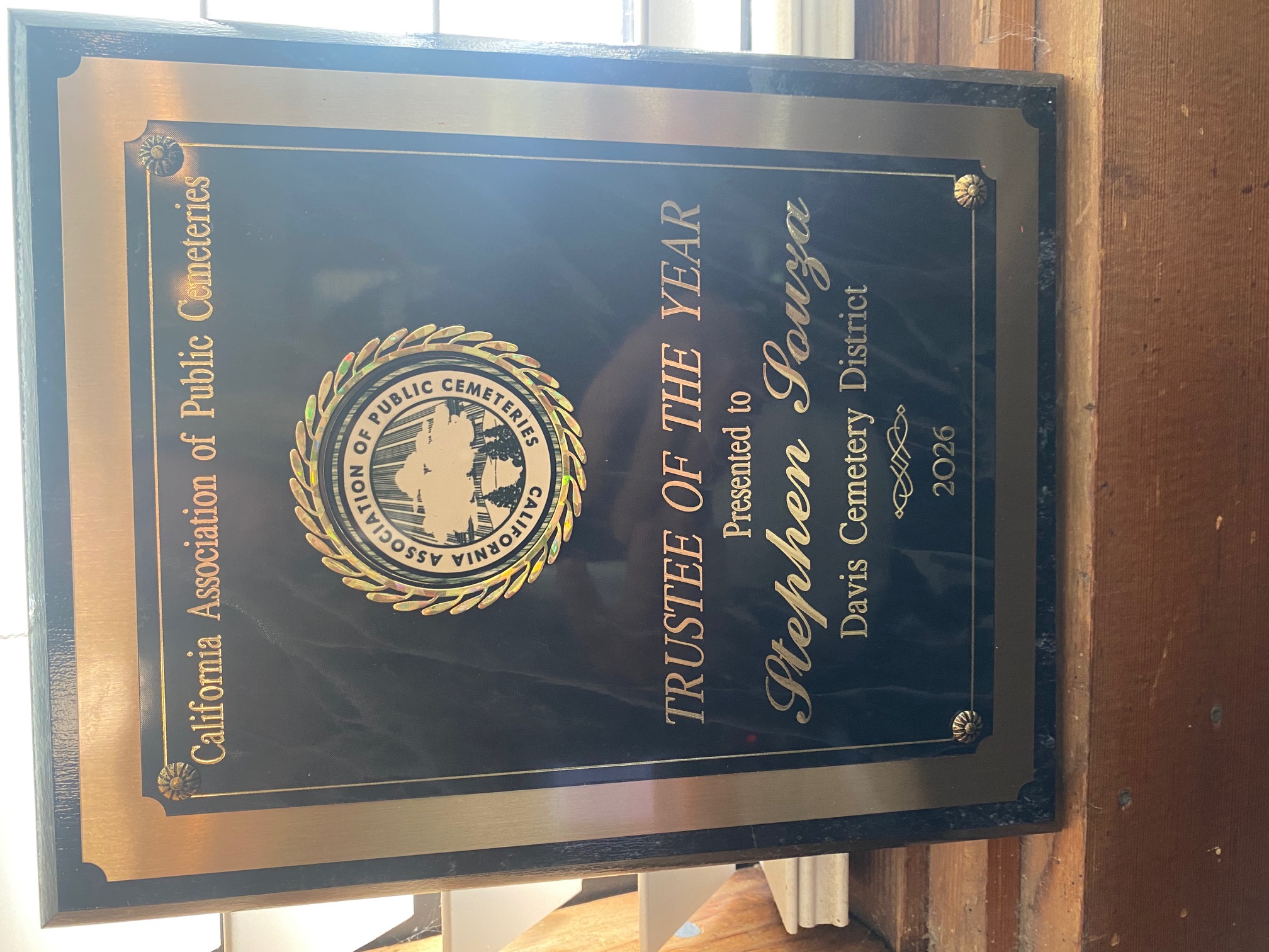 Stephen Souza, Trustee of the Davis Cemetery District was presented the “Trustee of the Year Award” at the 68th Annual Conference of the California Association of Public Cemeteries in Garden Grove, CA. on March 20, 2026.